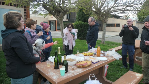 Certain-e-s avaient suggéré de marquer cette fin d'année 2025 en organisant un repas ou un goûter, mais pour certains, faire une rando après un repas, c'était incompatible avec leur organisme, nous avons donc opté pour un goûter d'après rando. Après avoir consulté différents sites météo, le GO a choisi le 11 décembre, même si une dernière sortie 2025 aura bien lieu la semaine prochaine. C'est après qu'il s'est rendu compte que ce jour-là présente en plus l'intérêt d'être la Saint Daniel, comme le hasard fait bien les choses ! Comme il faisait un peu frais, nous avons réduit un peu le parcours habituel. Il nous a fallu toutes les boissons (pétillantes ou pas) et tous les bons gâteaux pour supporter le vent et le froid, ce fut malgré tout un super moment de convivialité, il faudra refaire ce genre de réjouissance au printemps.